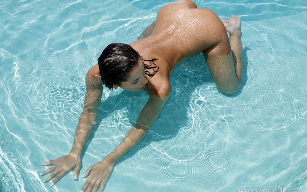Naked brunette in the pool