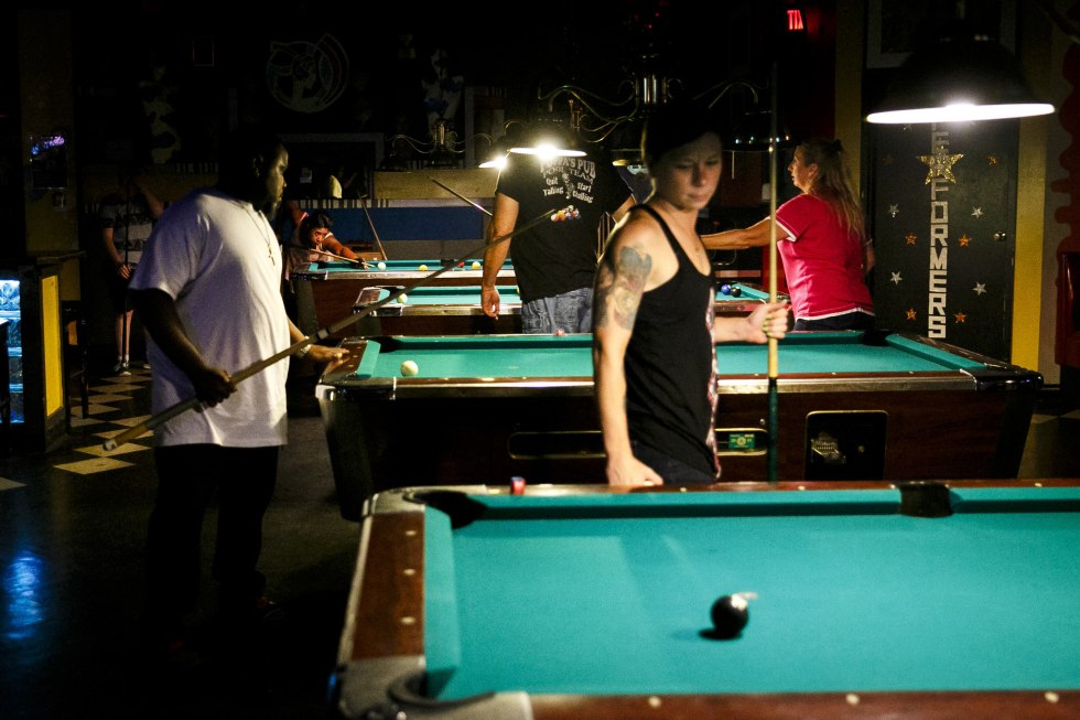 Tarra White on a billiard table