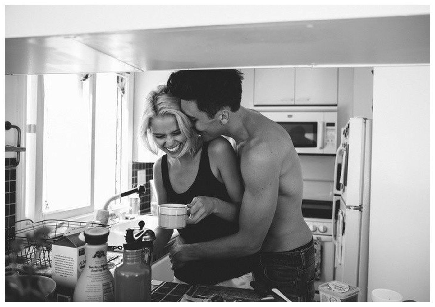 The couple hugs in the kitchen