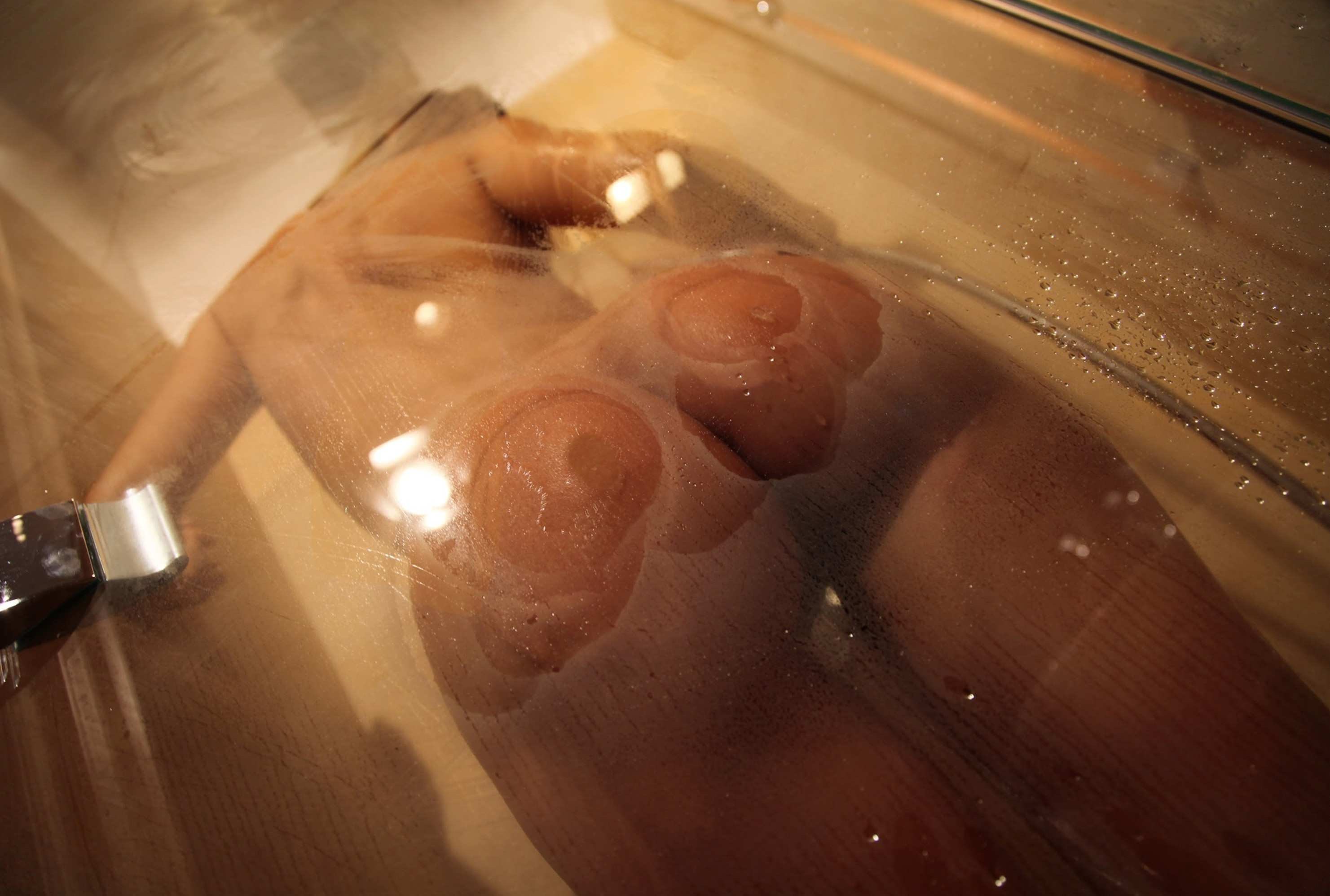 Naked boobs pressed to glass