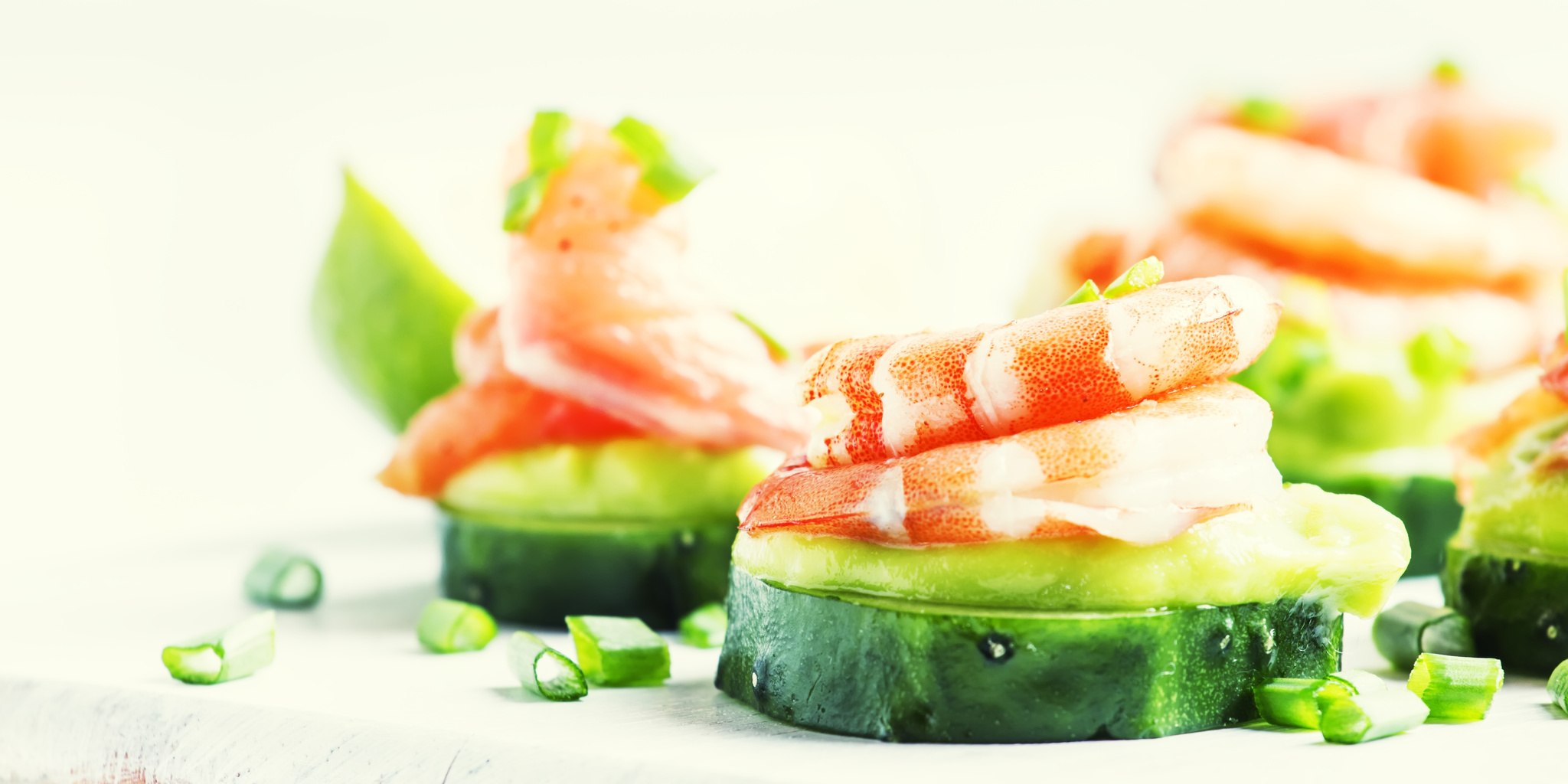 Canapes with shrimp and avocado and cucumber